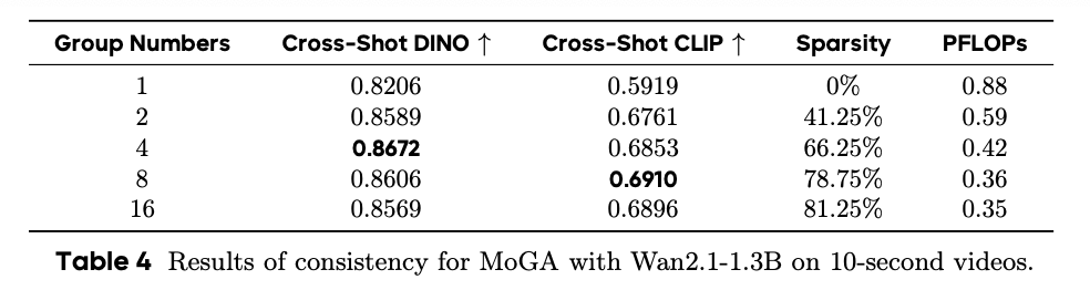 路由组数M: 在固定计算预算下对组数进行了消融研究(下表 4)。跨镜头 DINO 和 CLIP 分数随着组数的增加呈现出先上升后下降的趋势。这表明适度的分组稀疏性在全局一致性和效率之间取得了平衡,在保持计算效率的同时产生了接近最优的一致性。