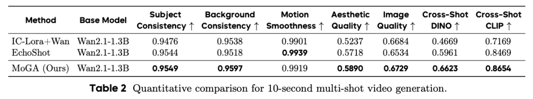 接下来,将 MoGA 与其他多镜头视频生成方法进行比较。下表 2 报告了 MoGA、IC-LoRA+Wan 和 EchoShot 之间的定量比较。尽管依赖于稀疏注意力,我们的方法在大多数指标上优于完全注意力基线(EchoShot),这表明保留显著 token 间的交互不仅能减少 FLOPs,还能抑制无关内容带来的噪声。这带来了更强的人物身份一致性和改进的时间场景连贯性。