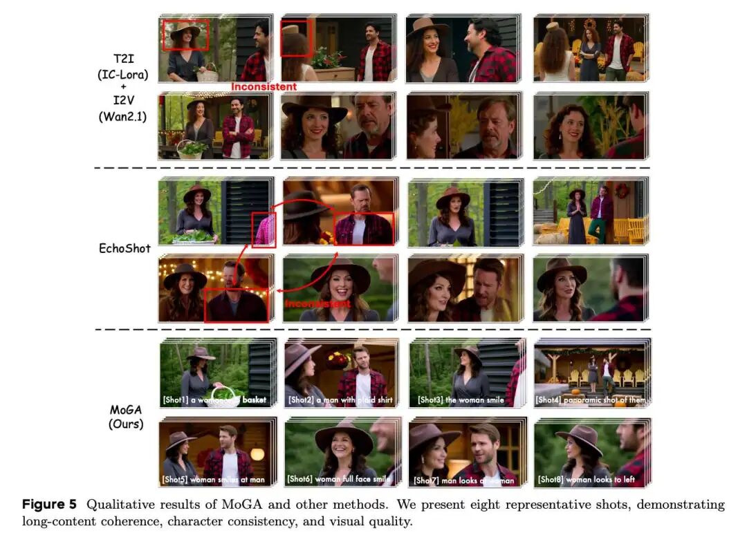 EchoShot 能够扩展到更多镜头,但在长时间范围上仍然显示出明显的跨镜头不一致性。相比之下,MoGA 在延长的持续时间内保持了稳定、连贯的内容。例如,即使没有在镜头间重复或明确指定,女士的帽子也始终保持一致。由于 STGA 缺乏显式的跨镜头信息交换,这种一致性可归因于 MoGA,它有效地选择并保持了跨越镜头的身份和上下文。