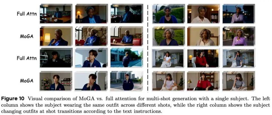 主体一致性的可控性。下图 10 可视化比较了 MoGA 与完全注意力。两种模型均在 10 秒数据上使用 Wan2.1-14B 进行训练。左图展示了 MoGA 在多个场景中保持主体身份的能力,而右图展示了其在保持身份一致性的情况下对外观变化(例如,服装)的鲁棒性。尽管具有 71.25% 的稀疏度,MoGA 实现了与完全注意力相当的叙事连贯性和内容可编辑性,并且在某些情况下提供了更优的性能。