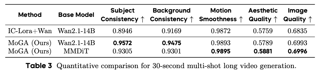 最后,对长视频生成进行基准测试并与基线比较。由于很少有开源方法能生成 30 秒的多镜头视频,将 MoGA(具有两种骨干网络)与 IC-LoRA+Wan 进行比较。如下表 3 所示,在相同骨干网络下,MoGA 大幅优于 IC-LoRA+Wan,凸显了端到端建模相较于多阶段流程的优势。值得注意的是,即使在激进的稀疏度下,基于 MMDiT 的 MoGA 仍保持了高视觉保真度,表明其通向更长上下文长度的可扩展路径。