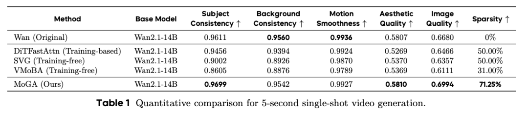 首先,将 MoGA 与先前的稀疏注意力方法在单镜头短视频生成上进行比较,遵循它们的评估设置以确保公平。如下表 1 所示,尽管稀疏度更高,但 MoGA 在所有指标上均比现有稀疏基线取得了一致的提升。值得注意的是,尽管我们的方法高度稀疏,但在多个指标上仍能匹配或超越原始 Wan(完全注意力)。