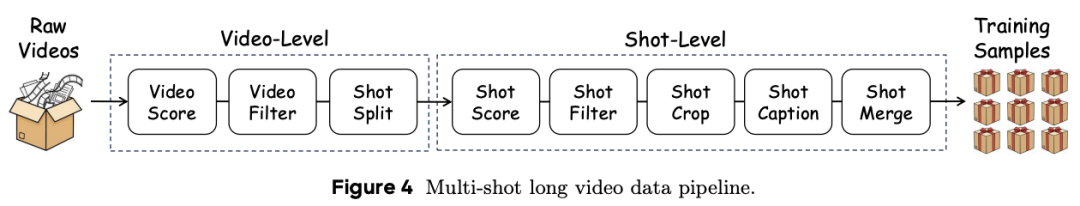构建了一个 Pipeline ,将原始长视频转换为一分钟、多镜头的片段,并带有密集标注,用于长视频生成。该 Pipeline 有两个阶段:视频级阶段和镜头级阶段(下图 4)。