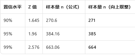 270、384这两个数字对我而言曾经就是工作中必背的两个数字。因为我的第一份工作就涉及了大量的抽样调查方案的制订,每当客户问我样本量怎么选择的时候我都会给出270和384两个数字供客户选择。怎么说呢,一个有零有整的数字会显得我这个咨询顾问非常专业,并且一个真的可以拿出公式的答案也可以说服一些比较较真的用户。虽然实操的时候我们一般推荐用户选择300个样本,因为报价更容易一些。