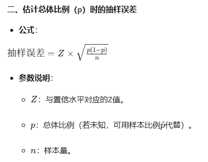 p 为总体比例。若事先未知,取最保守值 p=0.5,此时 p(1−p) 最大,算出的样本量也最大。