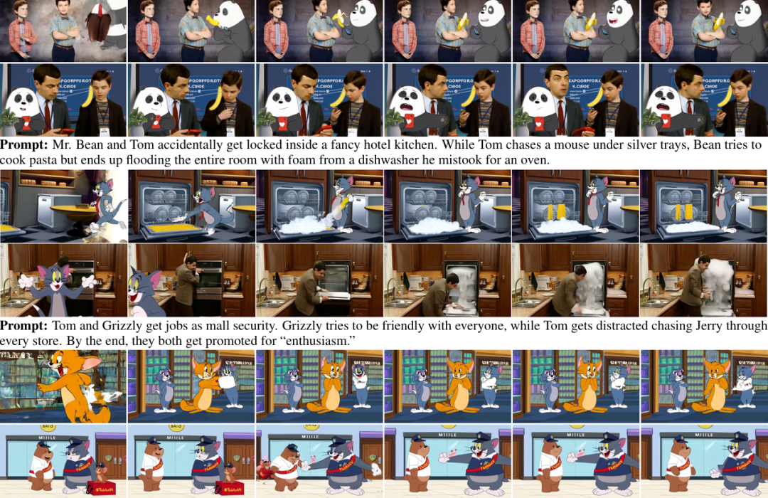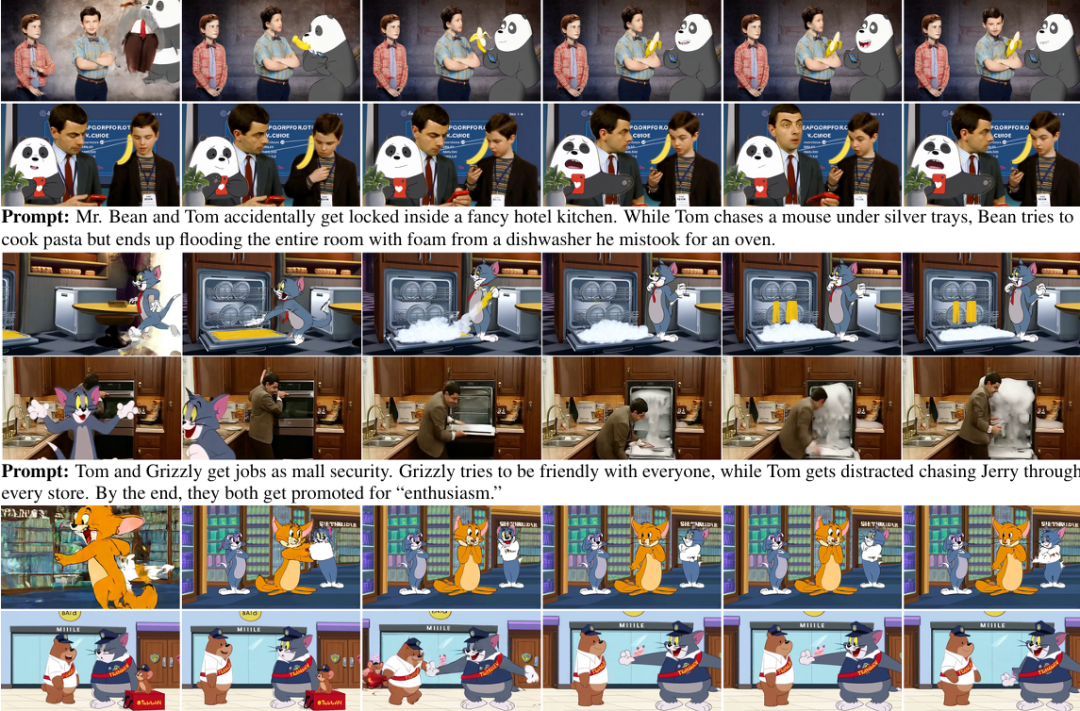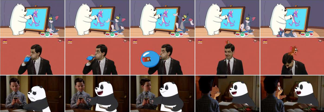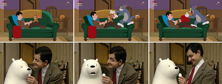 在MBZUAI团队的新实验中,AI真的让来自不同宇宙的角色同框:憨豆坐在沙发上,手里攥着三明治;杰瑞在旁边偷偷比鬼脸,汤姆在后头滑稽地摔倒。