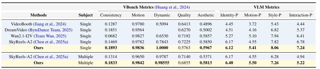 论文实验结果:在身份保持、风格一致与互动自然度上,新模型均显著超越SkyReel-A2、Wan2.1等主流系统。