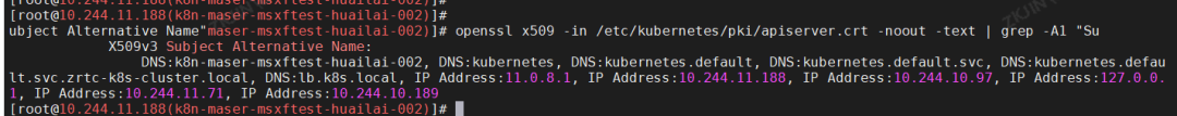 openssl x509 -in /etc/kubernetes/pki/apiserver.crt -noout -text | grep -A1 "Subject Alternative Name"