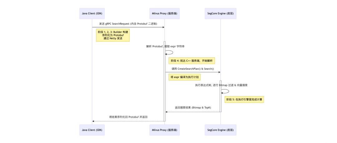 +、.concat() 或者 StringBuilder 在这里搞事情。filter 字符串,原封不动地被存了起来,秋毫无犯。Java SDK 真正干活的地方,是调用 MilvusServiceGrpc.search() 方法。在把我们的 SearchReq 对象转换成 gRPC 能认的 SearchRequest 时,代码是这样的: