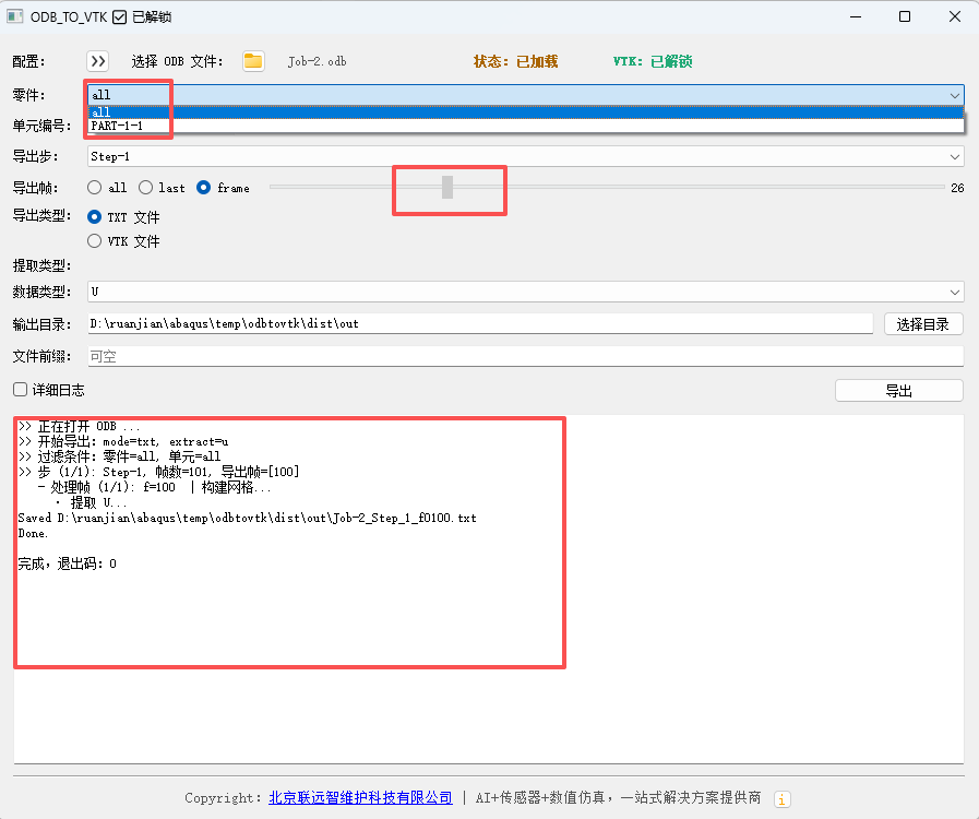 通过勾选对应Part、拖动滑块获取目标帧,后续导出时,能够获取日志信息,最终通过TXT文本获取目标信息。