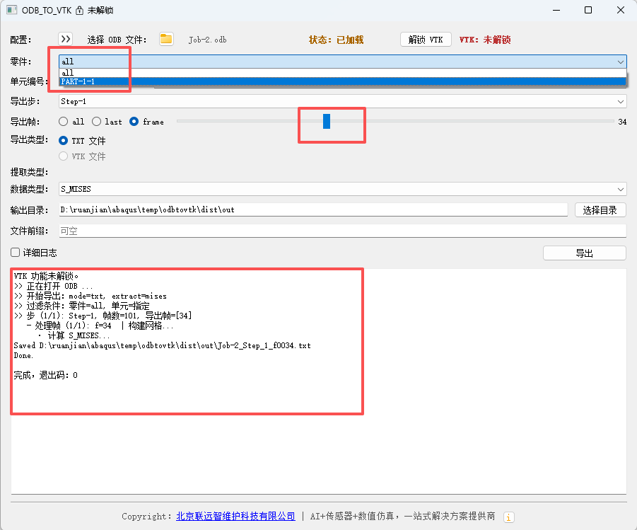 功能1:将Abaqus结果转化为TXT文本或VTK文件,通过可视化页面,能够将任意零件、任意载荷步、任意单元编号的Mises应力和位移输出为TXT文本,该部分功能完全免费,有需要的可以直接获取,具体下载链接为: