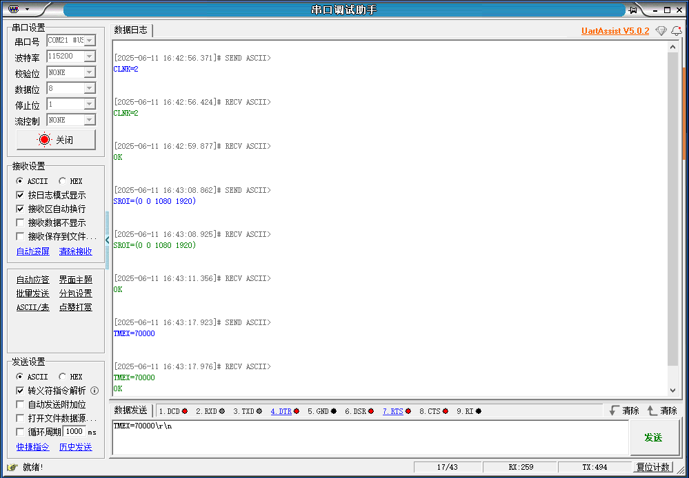 请运行Full模式程序,然后打开串口调试助手,依次输入命令"CLNK=2\r\n"配置相机为Full模式,输入命令"SROI=(0 0 1080 1920)\r\n"配置分辨率为1920x1080,输入命令"TMEX=70000\r\n"配置曝光时间为70000us。