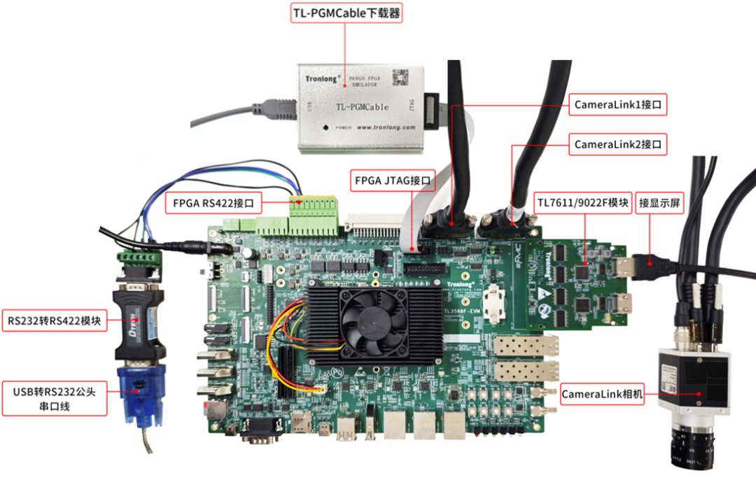 将TL7611/9022F模块、CameraLink相机、HDMI显示屏、评估板等对应连接,硬件连接如下图所示。