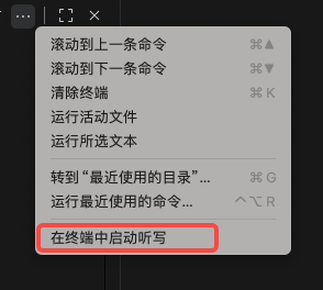 终端溢出菜单新增“Start Dictation”,利用macOS原生语音到文本功能,提升命令输入效率。