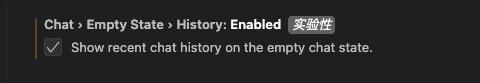 chat.emptyState.history.enabled在无活跃会话时显示本地聊天历史,配合⌥⌘↑/↓快捷键导航用户消息,续接上下文更高效。