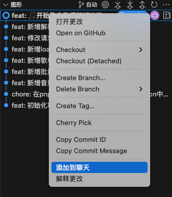 源代码管理 Graph 视图支持从历史提交右键“Add to Chat”,添加文件版本上下文,适合版本特定分析。
