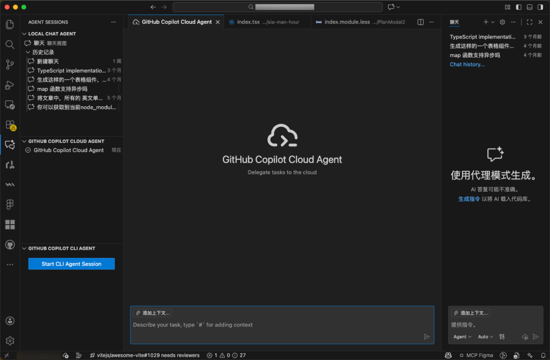 Copilot编码代理迁移至Copilot Chat扩展,与GitHub Mission Control无缝交互。CLI代理支持在聊天编辑器或集成终端创建/恢复会话,通过/delegate命令委托任务。编辑跟踪显示后台代理修改,通过内联标记和工作集视图清晰呈现。