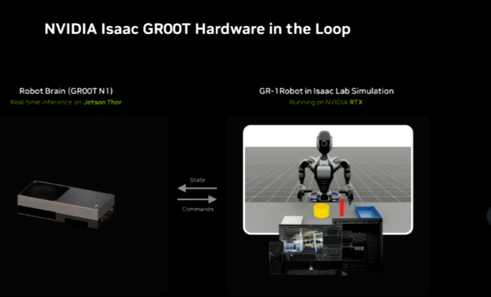 Isaac Groot是英伟达提供的杰出视觉-语言-动作模型,其性能表现令人惊叹。为了直观展示其能力,虽然理想情况下每位观众都应有连接Jetson Thor的人形机器人进行实操演示,但实际条件限制下,我们选择将Jensen的“计算机大脑”接入模拟器,模拟人形机器人任务执行。