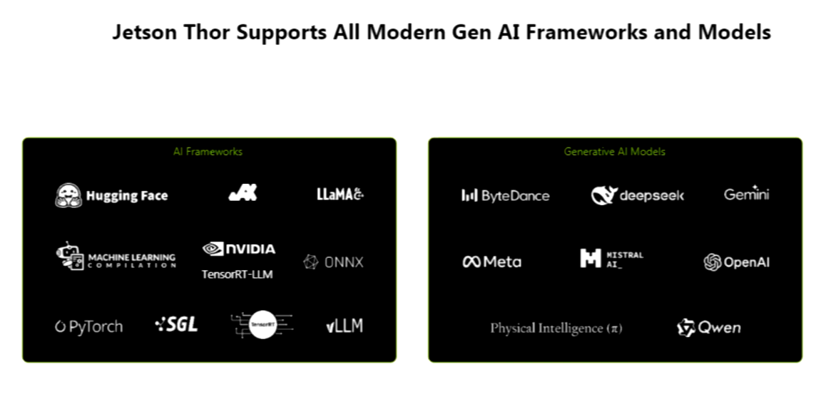 Jetson Thor 支持所有现代生成式人工智能框架和模型。