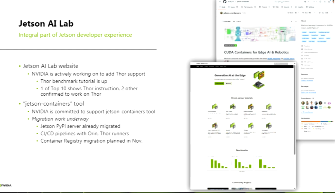 我们已针对 Thor(架构/平台) 推出了基准测试教程,部分现有教程已兼容 Thor,同时团队正积极扩展更多教程的支持。目前我们也在全力推进 Jetson 容器 的更新.英伟达将长期支持 Jetson 容器,相关功能不会取消。关于具体细节,我们会在近期提供更多信息。