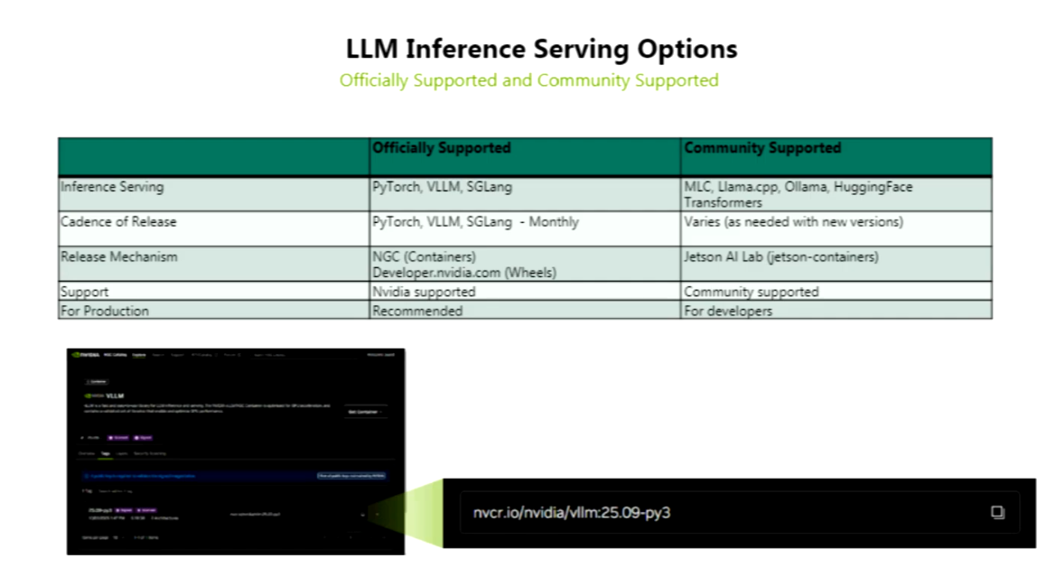 其中一些比较知名的解决方案包括 VLLM,不过需要说明的是,这些目前还没有得到英伟达的官方全面支持。