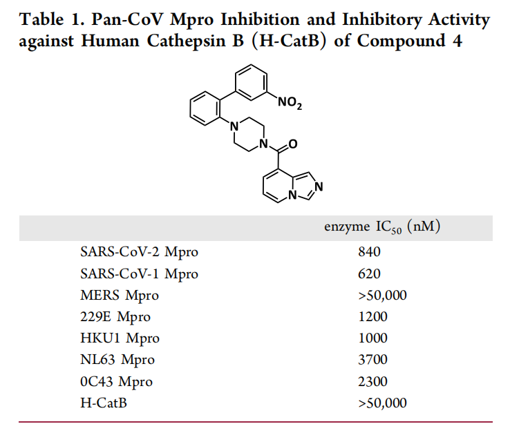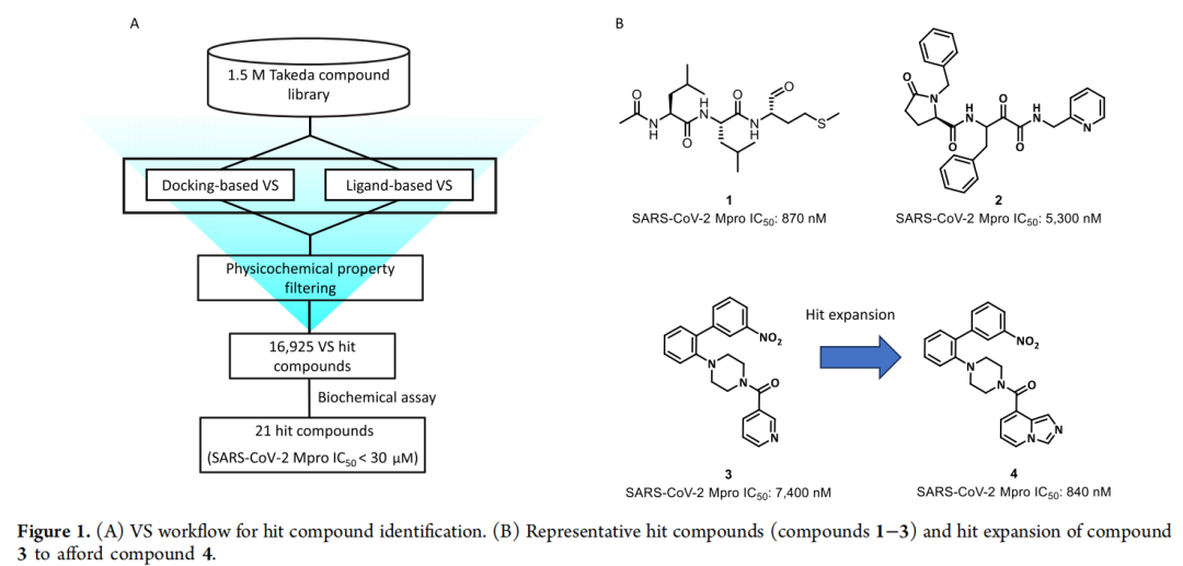 通过=ADMET性质预筛,共获得16,925个虚拟筛选命中化合物(VS hits),随后在SARS-CoV-2 Mpro生化抑制实验中进行了活性测试。最终获得21个具有不同骨架类型的命中化合物,IC₅₀均低于30 μM。其中化合物3(哌嗪母核结构)表现出非共价抑制活性(SARS-CoV-2 Mpro IC₅₀=7200 nM),虽活性中等,但因结构新颖、无亲电活性基团,被确定为先导优化的 种子化合物。