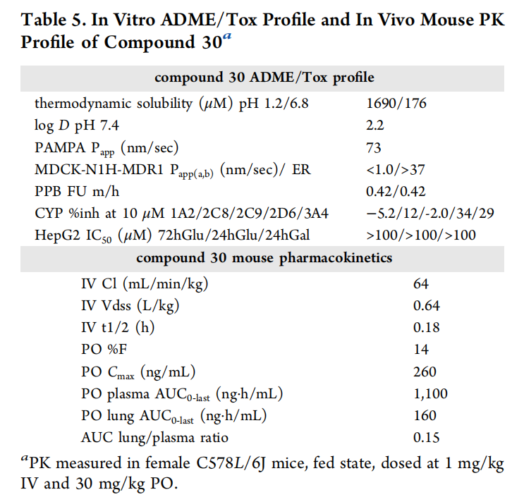 高活性化合物需具备良好的药代动力学特性才能进入临床,研究团队针对前期化合物代谢稳定性差的问题(人肝微粒体清除率CLint=85 mL/min/kg),通过降低脂溶性和引入羟基增强水溶性,最终得到化合物30。其成药性数据表现优异: