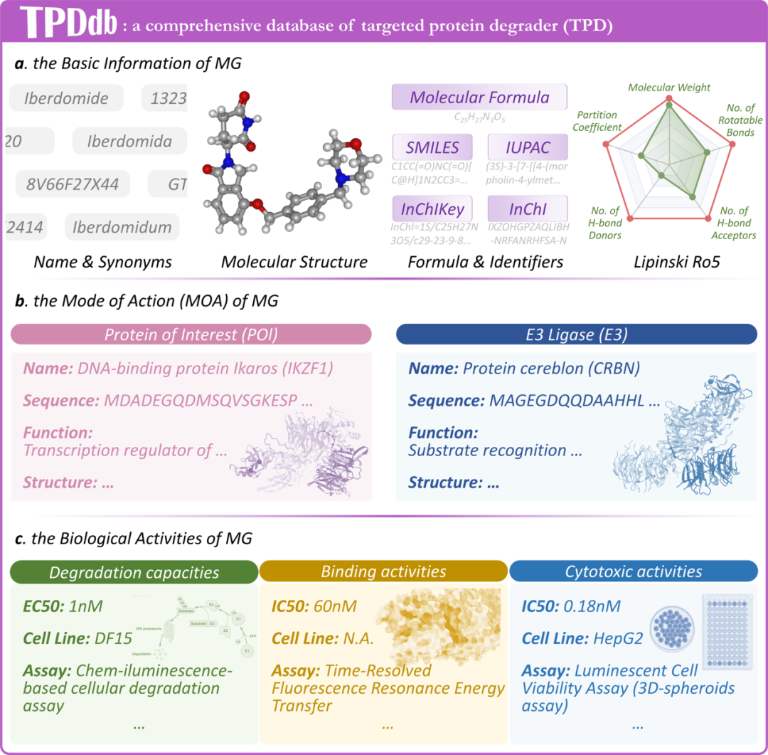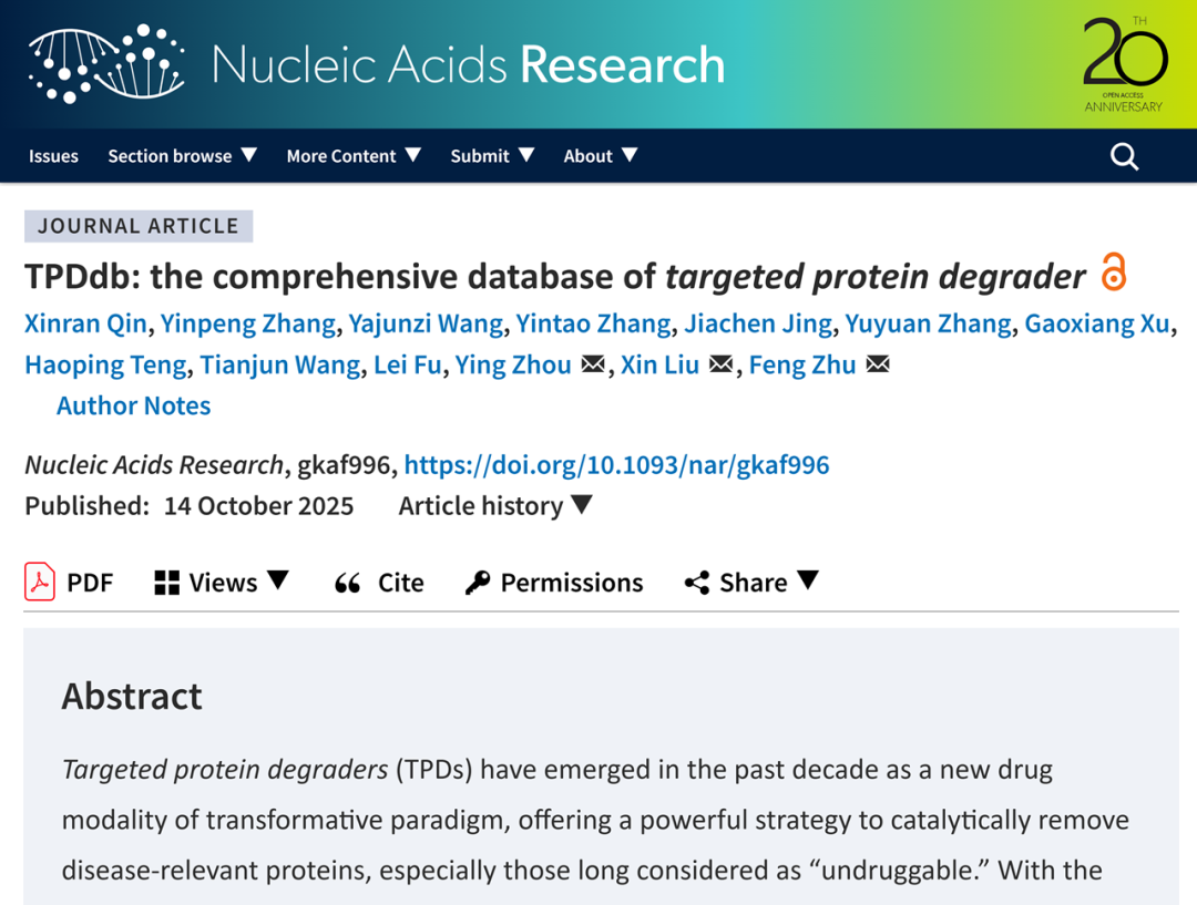 Xinran Qin, Yinpeng Zhang, Yajunzi Wang, Yintao Zhang, Jiachen Jing, Yuyuan Zhang, Gaoxiang Xu, Haoping Teng, Tianjun Wang, Lei Fu, Ying Zhou, Xin Liu, Feng Zhu, TPDdb: the comprehensive database of targeted protein degrader, Nucleic Acids Research, 2025;, gkaf996