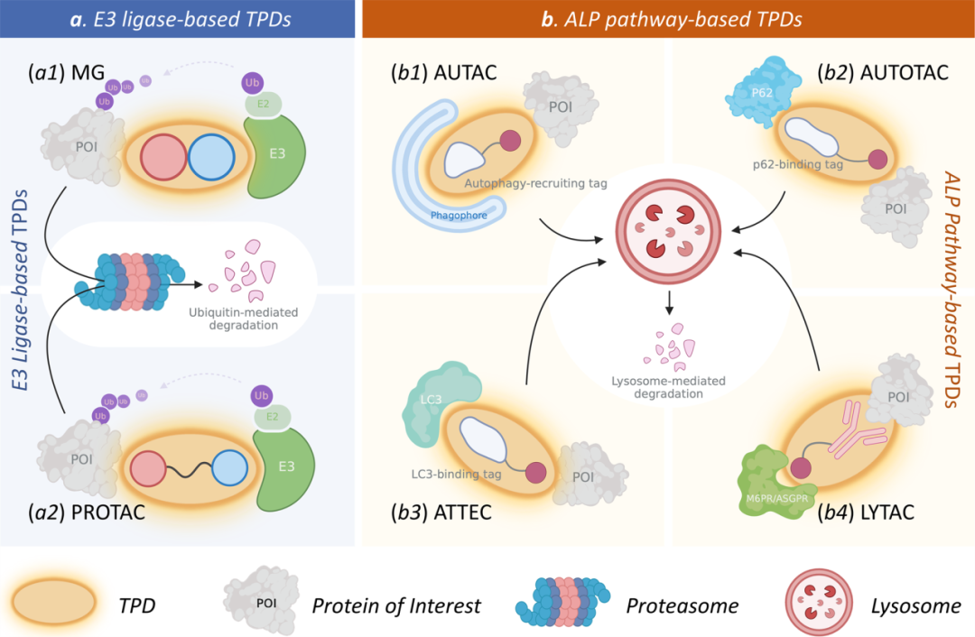 靶向蛋白降解(Targeted Protein Degradation, TPD)技术通过设计特殊分子,利用细胞自身的蛋白降解机制,特异性清除致病蛋白。TPD正在改变药物研发范式,为攻克“不可成药”靶点开辟新路。近日,浙江大学与西交利物浦大学合作发布了综合性靶向蛋白降解药物数据库TPDdb(https://idrblab.org/TPDdb),系统提供了六大类TPD资源:分子胶(Molecular Glue)、蛋白降解靶向嵌合体(PROTAC)、溶酶体靶向嵌合体(LYTAC)、自噬束缚化合物(ATTEC)和自噬靶向嵌合体(AUTOTAC、AUTAC)。