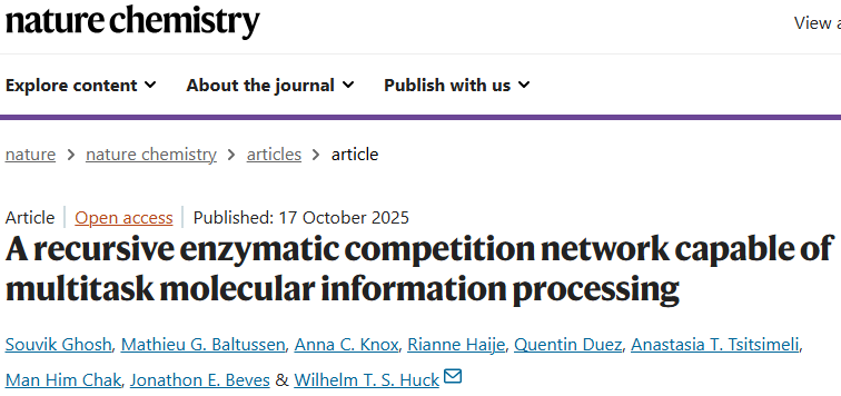 Ghosh, S., Baltussen, M.G., Knox, A.C. et al. A recursive enzymatic competition network capable of multitask molecular information processing. Nat. Chem. (2025).