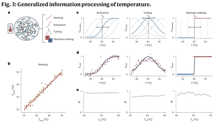 生命系统能够通过复杂的反应网络感知、整合并解释来自环境的化学与物理刺激。尽管人工酶促反应网络的设计在模仿生命系统方面取得了重要进展,但这些系统仍缺乏足够的复杂度以完全再现生物信息处理的特征。研究人员在此提出一种可扩展的设计策略,通过底层的底物递归竞争机制构建复杂的酶促反应网络,使其具备储备计算(reservoir computing)能力。该基于蛋白酶的网络能同时执行多种离散与连续的分子信息处理任务,包括肽序列与物理化学输入的分类。其酶促储备体可在 25–55 °C 范围内充当温度传感器,精度达 ±1.3 °C,并能够执行类似神经系统的决策、激活与调节任务。研究人员还展示了网络在时间信息处理方面的潜力,以及通过光脉冲实现与光学系统直接接口的可能性。这一结果揭示了基于竞争机制的分子系统能够实现逐步增强的分子级信息处理能力。