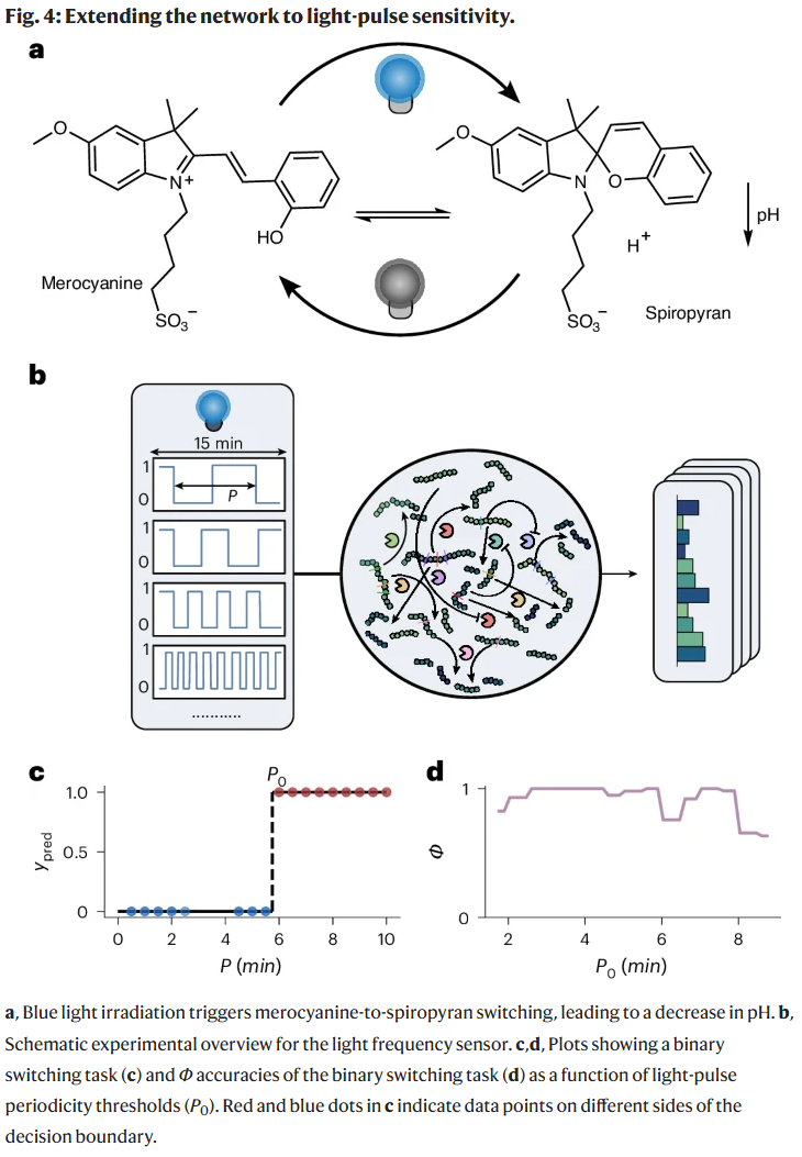 研究人员进一步将输入扩展至光信号,实现与光学系统的直接耦合。通过在反应液中加入光致变色 merocyanine 染料,蓝光照射可使其转化为 spiropyran,从而使溶液 pH 降低约 3.5 个单位。该体系在固定温度(30 °C)下接受周期为 30–600 s 的光脉冲。