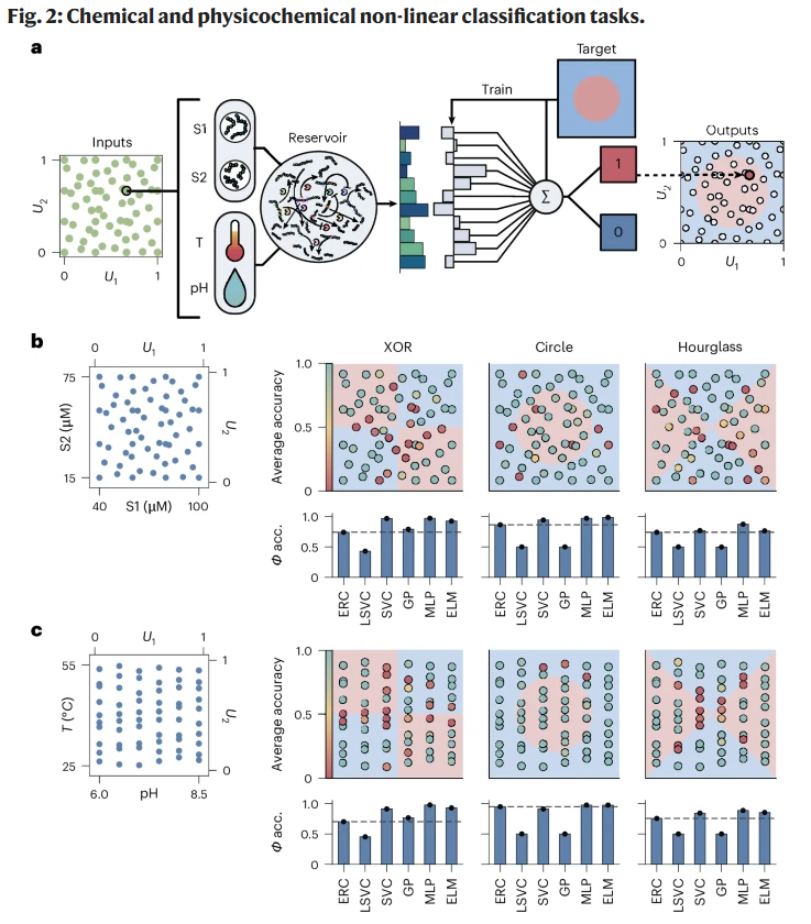 研究人员首先以两组肽输入(S1 与 S2)为变量,随机采样浓度范围后,执行 XOR、环形与沙漏三种经典非线性分类任务。结果显示,该酶促储备网络在分类精度上可与支持向量机、极限学习机等常规机器学习算法相媲美。