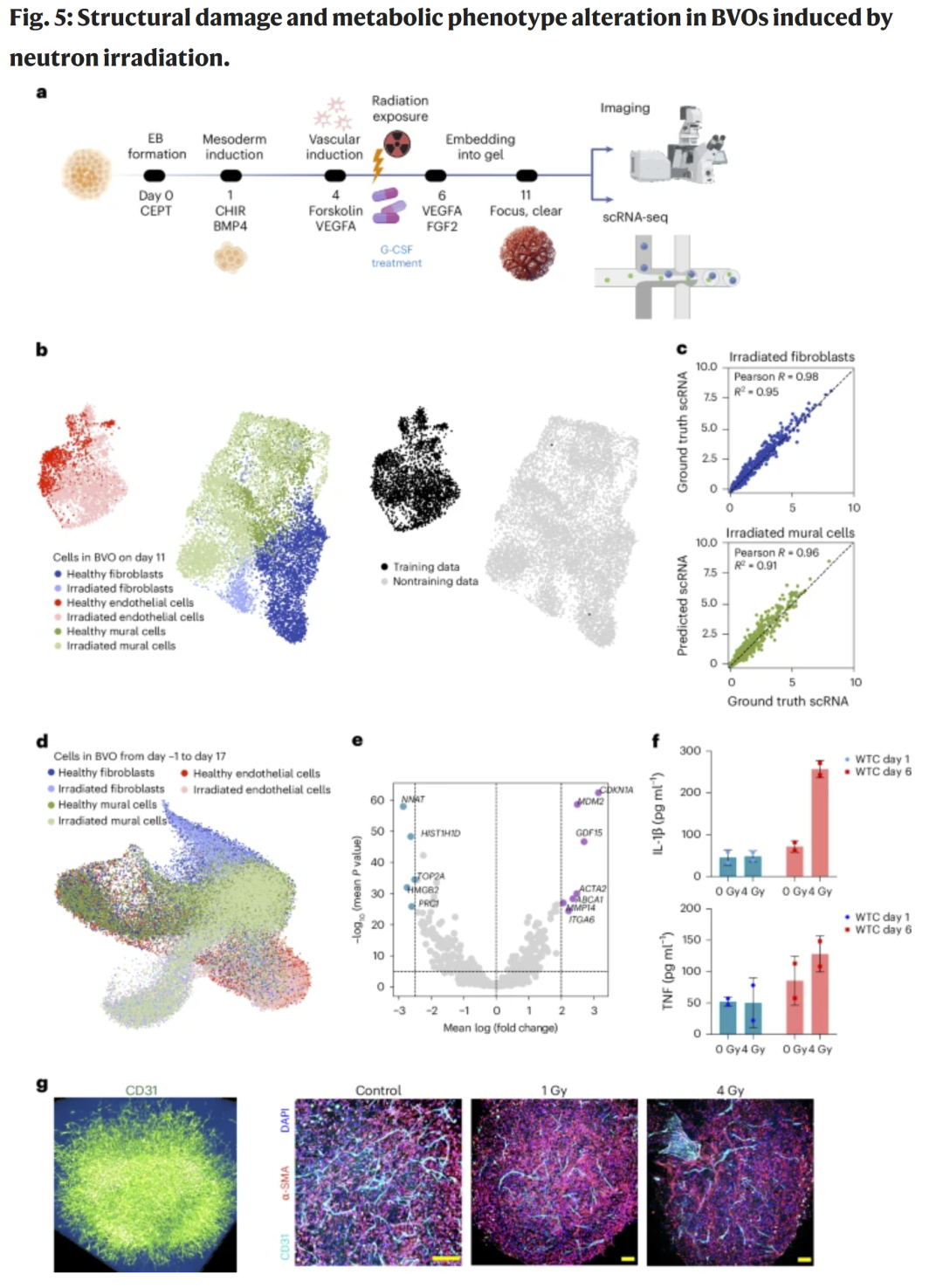 在神经中子辐射实验中,Squidiff 模拟了血管类器官细胞的应答。模型发现辐射导致显著的分子紊乱:早期细胞受损最重,主要上调基因包括 CDKN1A、MDM2、GDF15、ACTA2、MMP14 等,涉及 p53、TNF 与 NF-κB 信号通路。辐射后类器官体积缩小、细胞死亡率增加、IL-1β 与 TNF 分泌上升,表明强烈炎症反应。Squidiff 成功重建这些动态损伤过程。