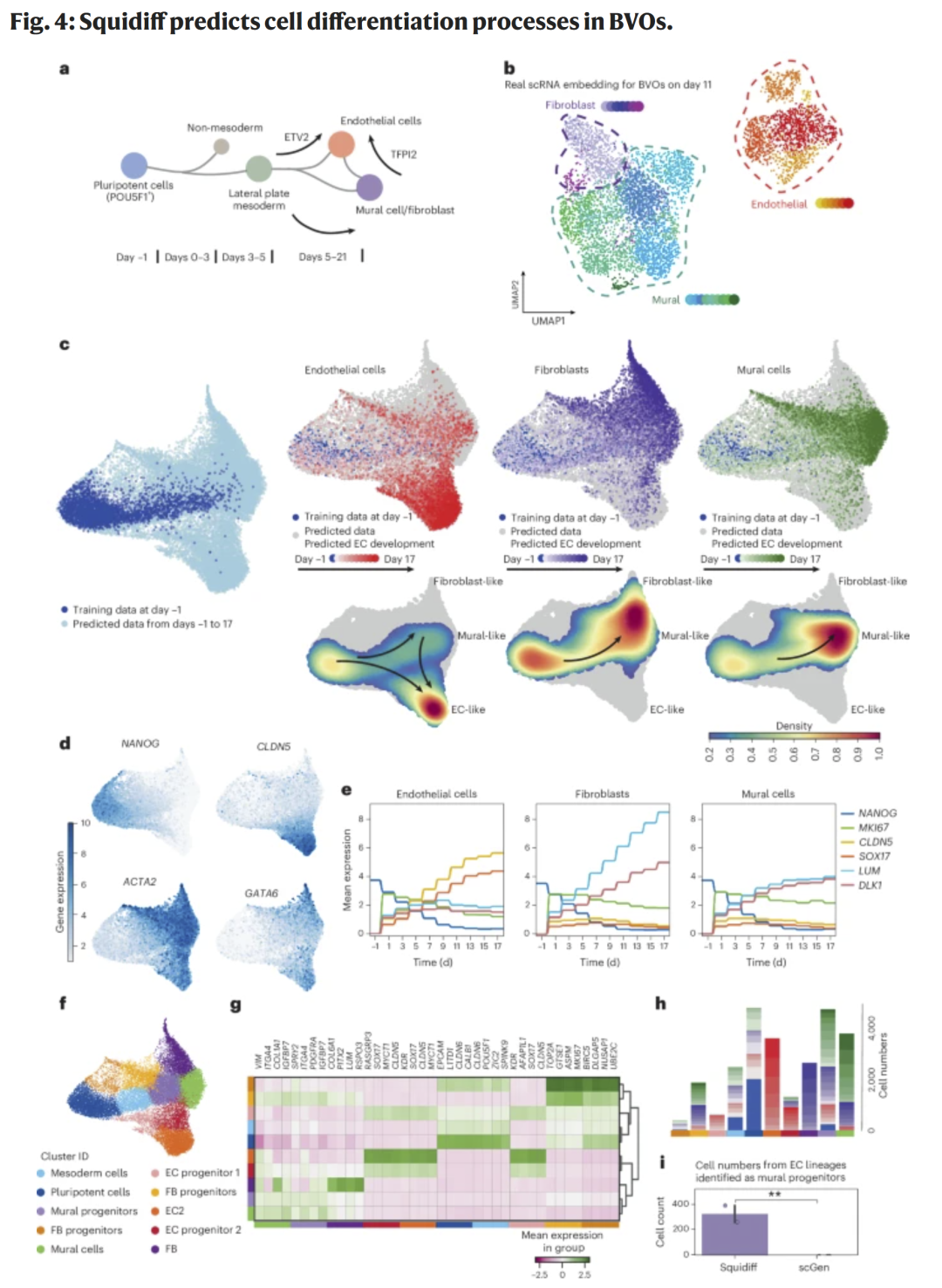 仅使用内皮细胞训练数据,Squidiff 即可生成成纤维与平滑肌细胞的响应谱。模型预测表明: