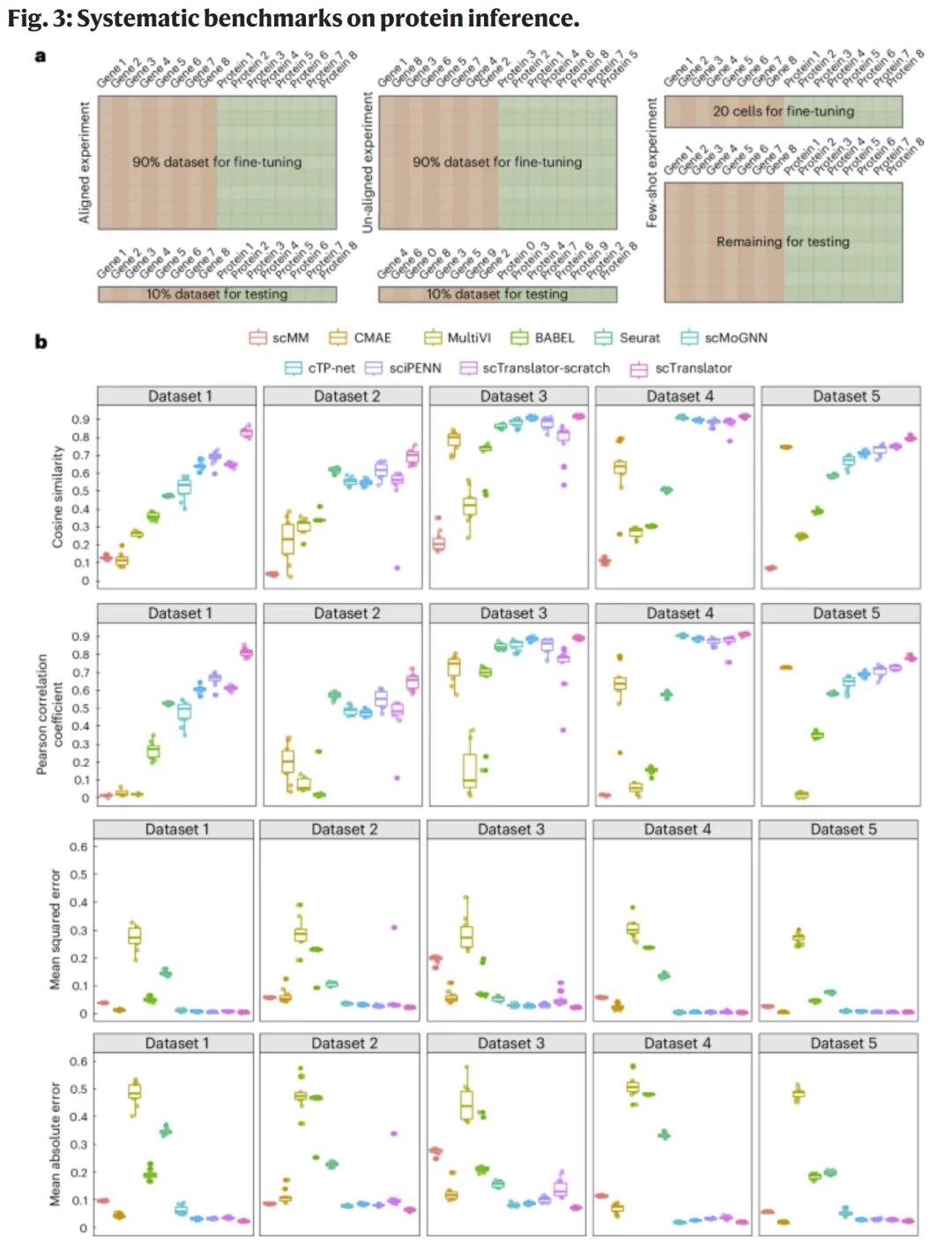 研究人员将 scTranslator 与九种单细胞多组学或RNA–蛋白预测框架(如 cTP-net、sciPENN、Seurat、BABEL 等)进行比较。结果显示,在少样本(few-shot)实验中,scTranslator 在五个数据集上均显著优于所有对照方法,在余弦相似度、皮尔森相关系数及误差指标上均居首位。即便仅用20个细胞微调,模型仍能达到使用90%数据训练时的80–95%性能。在不匹配(unaligned)实验中,scTranslator 通过 GPE 模块保持高鲁棒性,展现对未见基因/蛋白的迁移能力。