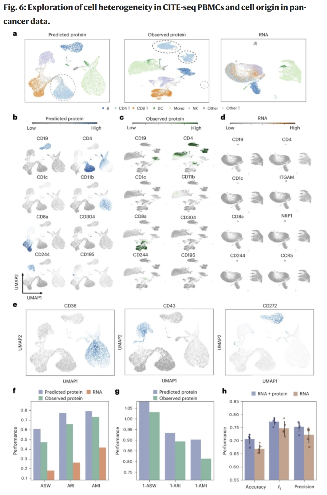 将scTranslator应用于16000个人PBMCs数据,推断得到的伪蛋白丰度在UMAP空间中呈现清晰的细胞聚类,与真实蛋白结果一致,且明显优于RNA信号的分辨率。模型能有效减少批次效应并保持细胞异质性。研究人员进一步发现新的潜在细胞标记物,为多组学整合分析提供了新的视角。