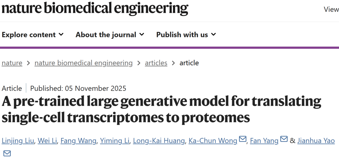 Liu, L., Li, W., Wang, F. et al. A pre-trained large generative model for translating single-cell transcriptomes to proteomes. Nat. Biomed. Eng (2025).