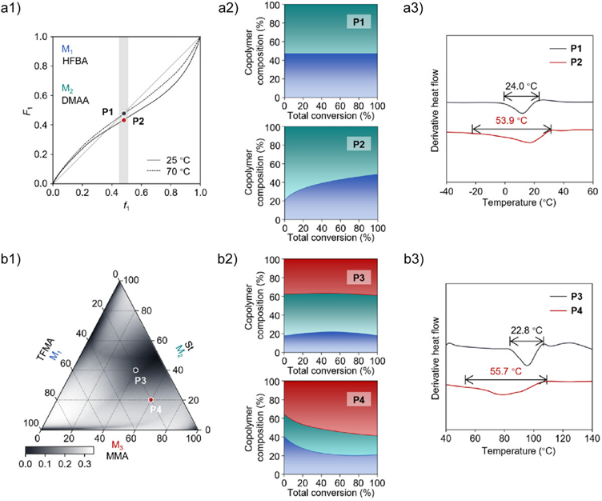 借助此模型,可以高效收集不同条件(如温度、溶剂)下的竞聚率,为实现序列调控奠定基础。作者选择六氟丁基丙烯酸酯(HFBA)与 N,N-二甲基丙烯酰胺(DMAA),比较了二元体系不同温度时的差异。在 70 °C 下聚合获得的 P(HFBA-co-DMAA)(P1)在整个转化率范围内维持几乎恒定的组成。相比之下,25 °C 下得到的 P2 为梯度序列共聚物,其链上重复单元比例随聚合进程逐渐变化。序列差异对应的性能差异也得到 DSC 验证:P1 的玻璃化温度区间更窄,而 P2的更宽。作者进一步探索了方法在三元体系中的适用性。传统方法通常用二元竞聚率近似三元体系,但往往误差较大。作者通过模型获得三元体系竞聚率,再利用 3D rFP 生成三角图,直观呈现随进料变化的组成漂移。例如在 TFMA–St–MMA 的三元体系中,三角图中颜色更深区域表示组成更均一的区域,意味着更接近共沸条件。(图5)