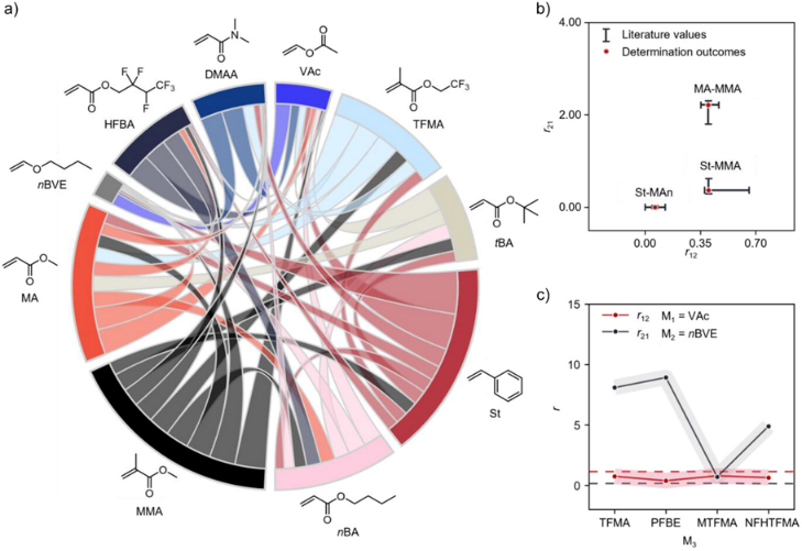 接着,作者从不同随机投料比实验中收集的转化率作为输入导入rFP 模型,模型在毫秒时间尺度内即可通过将实验数据匹配至对应的 2D 或 3D rFP 矩阵来确定竞聚率。测定结果包含置信区间,并将初始投料比与转化率的测量误差(±0.03)纳入预测过程。作者还开发了一个用户友好平台部署模型。在相同反应条件下模拟了 40 组单体对的二元竞聚率,并使用交互式弦图可视化。模型采用的转化率范围更广(0%–100%,传统方法通常 <10%),但是得到的二元竞聚率与文献中传统方法报道的高度一致。作者随后尝试将平台拓展至三元共聚体系,可以在较少的实验条件下预测完整的三元体系竞聚率。实验测试了 20 组三元体系竞聚率,包括醋酸乙烯酯(VAc)、正丁基乙烯醚(nBVE)、三氟乙基甲基丙烯酸酯(TFMA)等单体。作者发现引入第三单体或将某一单体替换为另一种,会显著改变原二元竞聚率,强调了直接预测三元体系的必要性。(图4)