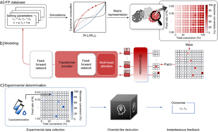 本文作者提出了“竞聚率指纹(reactivity ratio fingerprints, rFPs)”这一新概念,将二元和三元共聚反应数据矩阵作为rFPs,并进行对transformer 模型的训练。最终实现输入任意单体组合在任意投料比与转化率下的实验结果时,模型可以瞬时预测相应的二元、三元竞聚率。作者测定了40对二元单体组合、20对三元单体组合的竞聚率验证了模型的有效性,同时分析了温度、溶剂对于竞聚率以及序列调控的重要影响。(图1)