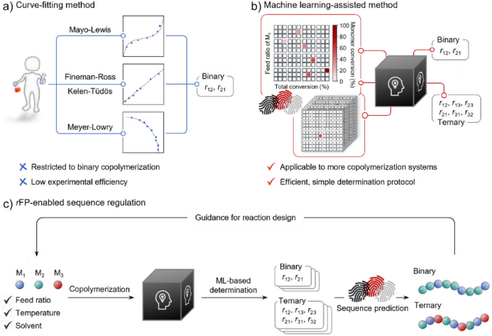 精确的单体序列对于生物大分子功能的实现至关重要。受自然体系启发,人们越来越关注合成聚合物的序列调控,并由此开发了适用于生物医学等领域的高性能材料。然而,在工业与学术界广泛采用的共聚体系中,序列调控仍然是一项艰巨任务,尤其是在含三种及以上组分的共聚中。竞聚率作为单体自增长与交叉增长速率常数之比,对理解和调控序列结构具有核心意义。自 20 世纪 40 年代以来,Mayo–Lewis等经典方法成为了标准工具,但是这些方法不仅对转化率范围有严格要求、实验操作繁琐、反应条件敏感,且通常仅适用于二元共聚体系,在复杂共聚体系中的根本局限仍未解决。