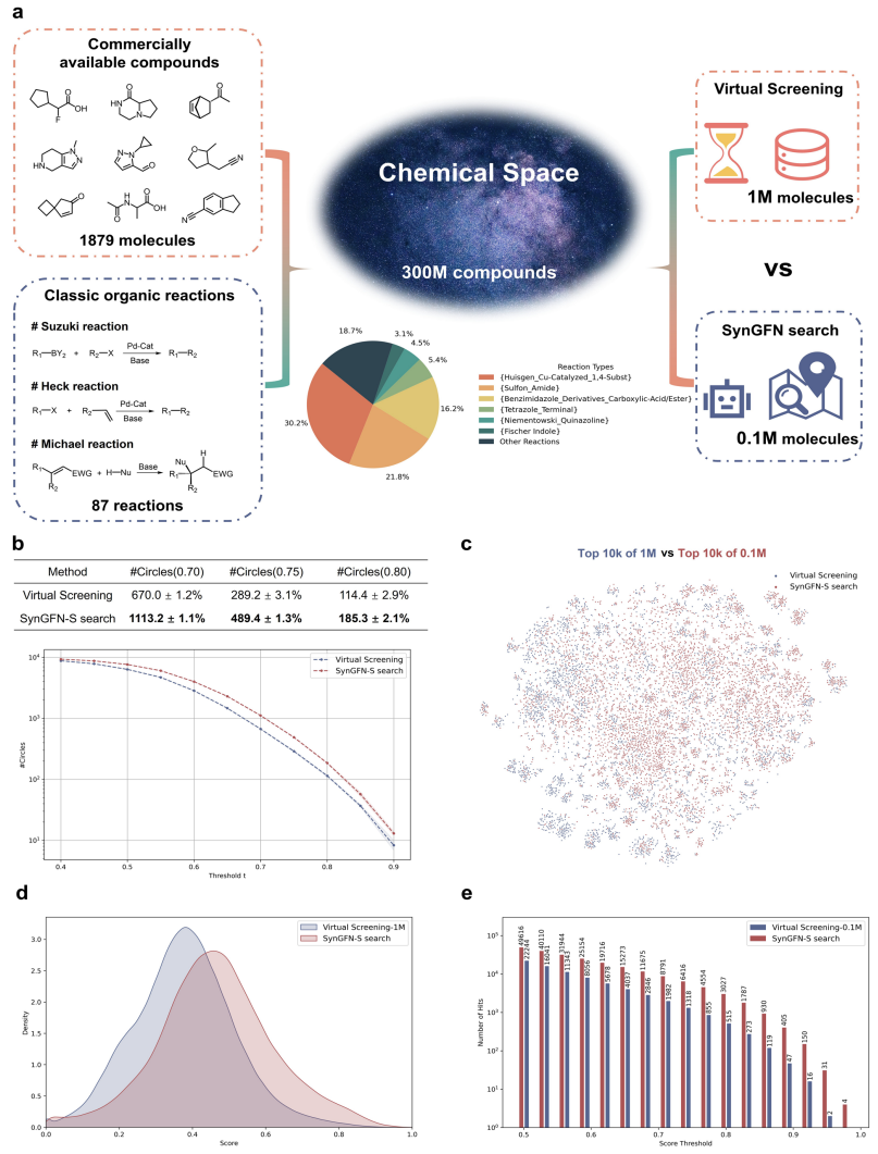 图2. SynGFN作为化学空间搜索算法与传统虚拟筛选的对比