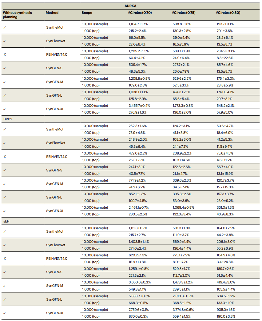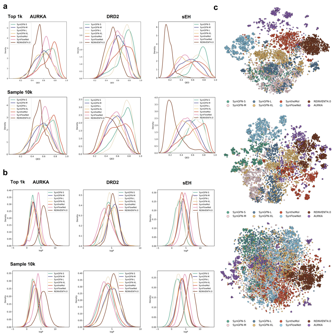 研究在S、M、L、XL四种规模的组合化学空间上训练 SynGFN,并与 SyntheMol、SynFlowNet和 REINVENT4.0进行系统比较(图3)。在AURKA、DRD2与sEH三个靶点上,每个模型采样1万分子,以药物相似性指标、QSAR 得分与结构分布等维度评估生成质量。结果表明,SynGFN在QED、logP等药物化学属性上持续占优,且在筛选前1000个高活性分子时表现更为突出。t-SNE结果显示,其生成分子分布更为广阔,结构新颖性与覆盖范围均优于其他方法。