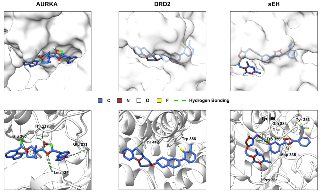 研究使用AutoDock Vina对各模型生成的前1000分子进行分子对接评估。结果表明,SynGFN在 DRD2和sEH等靶点中产生的高得分且多样的分子数量显著多于基线模型,提升幅度最高可达3–70倍。为消除Vina得分偏向大分子的影响,研究进一步采用LBE(Ligand Binding Efficiency)作为标准化指标。SynGFN在前10与前100分子中均保持高水平活性。与此同时,SynGFN-XL与已知活性分子的LBE分布高度重叠,RMSD 多集中在1–2 Å 范围内,说明生成分子可形成合理结合模式。具体案例分析显示,SynGFN生成的分子能稳定嵌入蛋白结合口袋(图4),形成较好相互作用,具有良好成药前景。