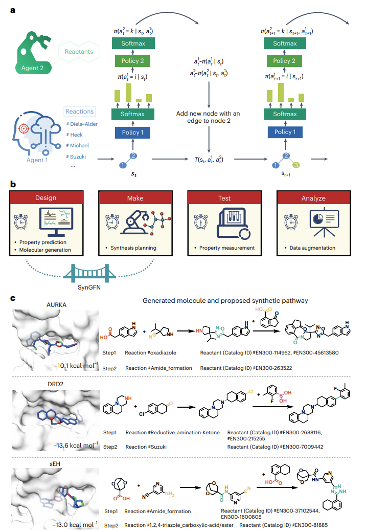 尽管近年来涌现了众多分子生成模型,但鲜有工作能够同时、系统地解决影响AI驱动分子设计实用性的三大核心瓶颈:合成可行性约束缺失、化学空间覆盖不足以及高成本反馈限制。本研究提出的SynGFN为这一系列问题提供了一种统一而有效的解决思路。通过在化学空间构建与分子生成过程中引入明确的化学合成约束,研究团队将传统意义上“逐步添加子结构”的分子构建过程,转化为“基于反应模板逐步添加反应物”的反应式组装过程,使模型能够在生成分子的同时实时给出可执行的合成路线。这种反应驱动的生成方式从根本上缓解了可合成性不足的问题,为后续进入实验阶段创造了条件。