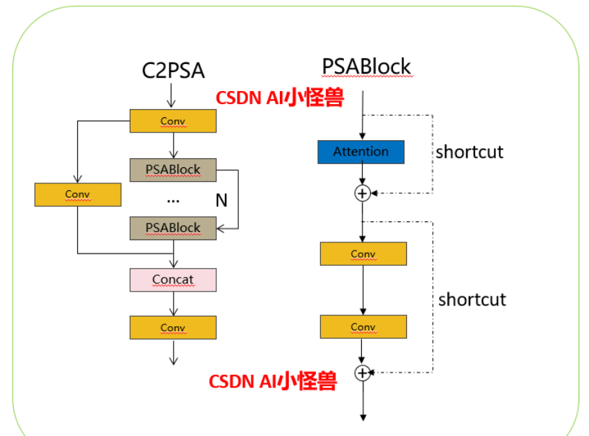 self.m = nn.Sequential(*(Bottleneck(c_, c_, shortcut, g, k=(k, k), e=1.0) for _ in range(n)))借鉴V10 PSA结构,实现了C2PSA和C2fPSA,最终选择了基于C2的C2PSA(可能涨点更好?)