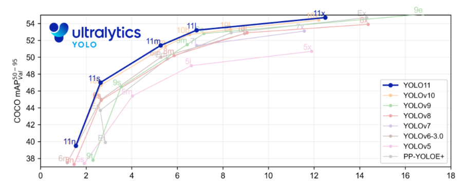Ultralytics YOLO11是一款尖端的、最先进的模型,它在之前YOLO版本成功的基础上进行了构建,并引入了新功能和改进,以进一步提升性能和灵活性。YOLO11设计快速、准确且易于使用,使其成为各种物体检测和跟踪、实例分割、图像分类以及姿态估计任务的绝佳选择。