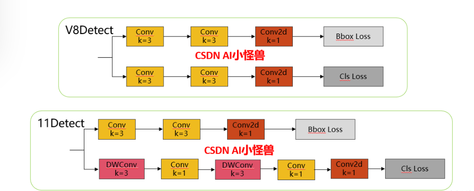 self.m = nn.ModuleList(PSABlock(self.c, attn_ratio=0.5, num_heads=self.c // 64) for _ in range(n))分类检测头引入了DWConv(更加轻量级,为后续二次创新提供了改进点),结构图如下(和V8的区别):