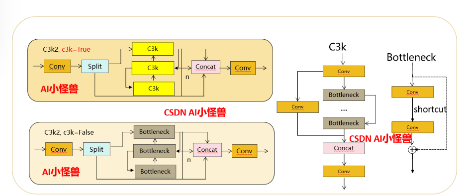 C3k2,继承自类C2f,其中通过c3k设置False或者Ture来决定选择使用C3k还是Bottleneck